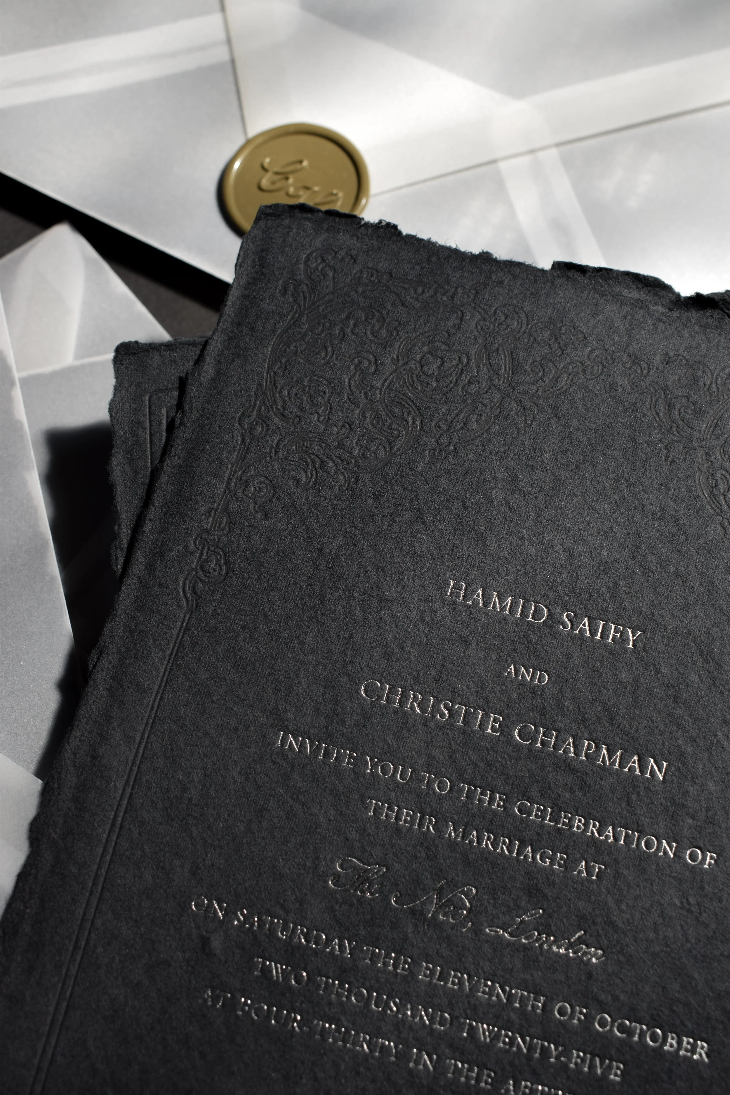 Modern black wedding invitations with gothic borders, foil lettering, and vellum wraps — designed for stylish, design-led celebrations.